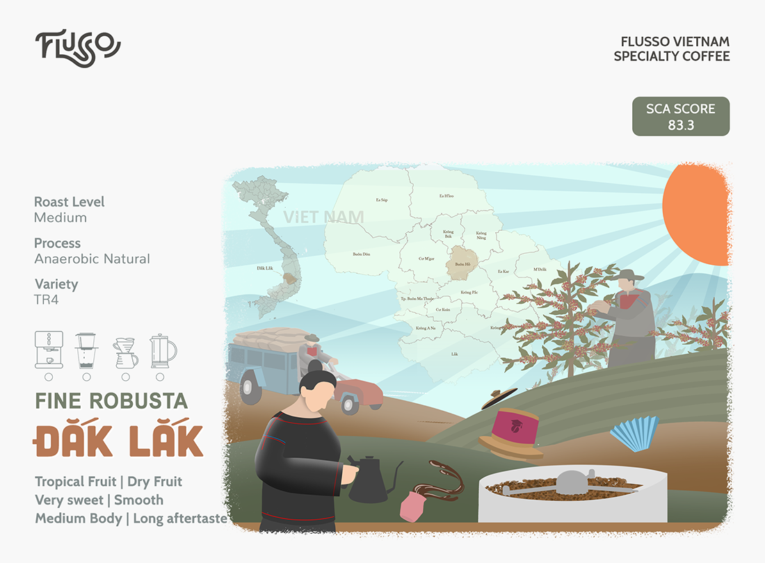 Cà phê Buôn Hồ Đắk Lắk gây ấn tượng với hương trái cây rõ nét. Tropical fruit mang lại cảm giác tươi mới ngay từ đầu.